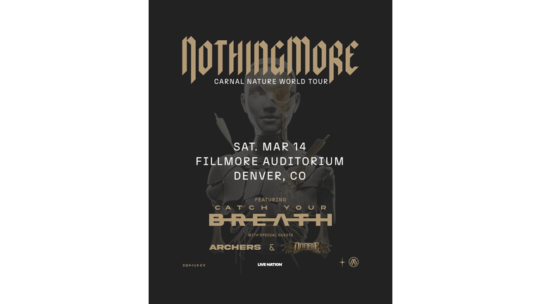 Nothing More Carnal Nature World Tour Featuring Catch Your Breath with special guests Archers and Doobie Fillmore Auditorium Saturday, March 14, 2026 All Ages Doors: 5:30PM | Show: 6:30PM >>TICKETS