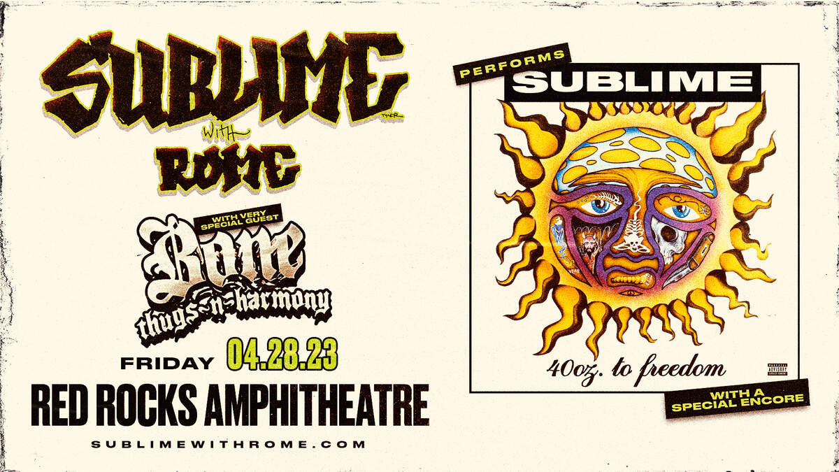 Photo: AEG PresentsSublime with Rome performs 40oz to Freedom with Bone Thugs-n-Harmony Red Rocks Amphitheatre Friday, April 28, 2023 >>Tickets Pre-Sale: Thursday, Dec 15 from 10a – 10p MT, PW: SANTERIA Register HERE