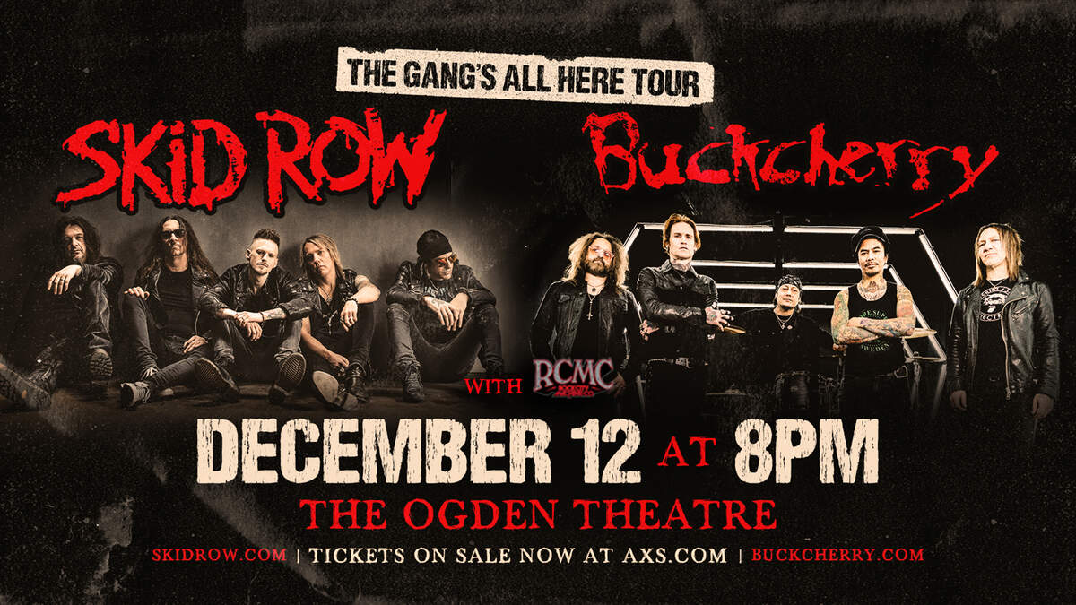 Skid Row & Buckcherry The Gang's All Here Tour with Rock City Machine Co Tuesday, December 12, 2023 Ogden Theatre Ages: 16+ Doors: 7pm | Show: 8pm >>TICKETS Presale: Thursday, 04.27.23 @ 10AM-10PM Password: SRBC23 On sale: Friday, 04.28.23 @ 10AM